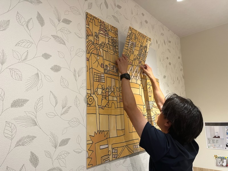 | 貼る前の下準備(テープである程度の位置出し、磁器シート張り) | パネルと磁器シートで固定。微調整をして完成。 | |